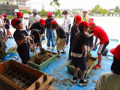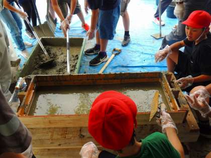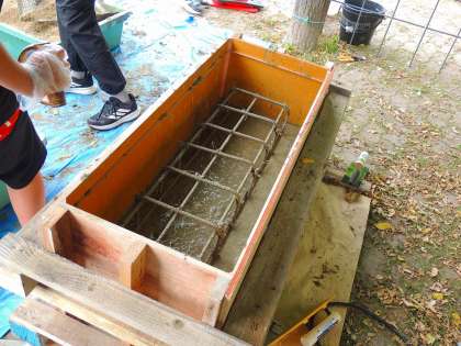 鉄筋結束練習が終わると、セメントに水や砂利、砂を混ぜて生コンクリートをつくりました。それをベンチの枠に流し込みました。後は、乾かして完成を待つのみです。