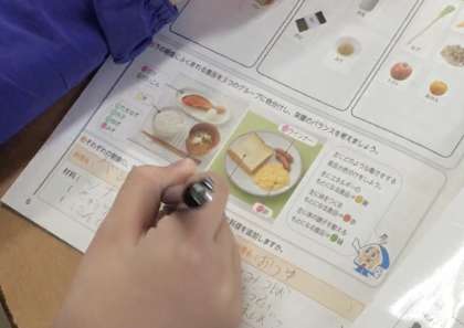 6年2組さん、家庭科の授業で「朝食に一品足してみよう」を考え、発表していました。