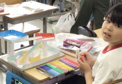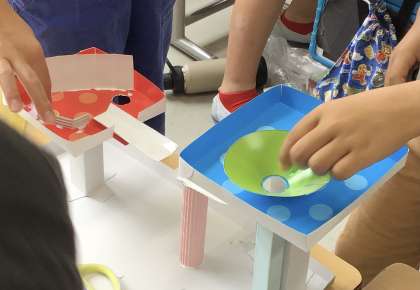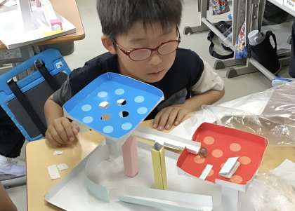 ビー玉が丸い道を通れるように紙の形を工夫する女の子。