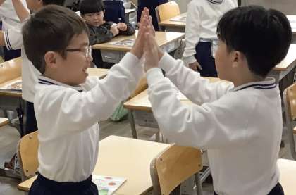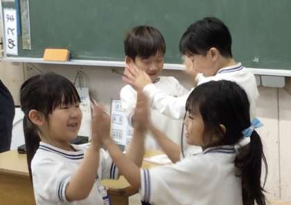 1年2組さん、音楽で「おんがくをとおして、なかよくなろう」ということで、曲を聴きながら友達と一緒に踊っていました。
