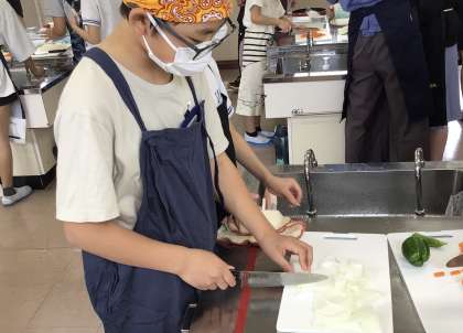 玉ねぎを途中で向きを変えると切りやすくなることに気づいた男の子。
