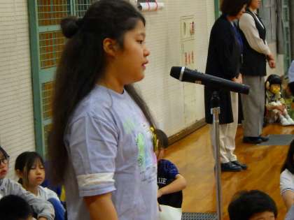 全校のみんなの目線が舞台に集まるので、緊張をするかと思いきや、教室でスピーチタイムなどの取組をずっと経験している高学年の子たち、堂々とお話できる子がとても多いです。