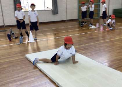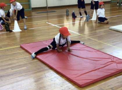 今日も開脚の練習、前回り、後ろ回りの練習をしていました。