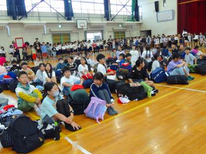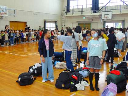 出発式が終わるころ、全校の子が体育館に集まって、5年生を見送りました。
