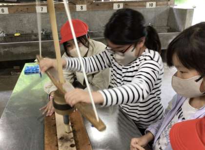 火起こしをする子、板がずれないように押さえる子、応援する子、手分けをして活動します。
