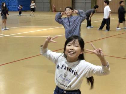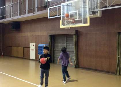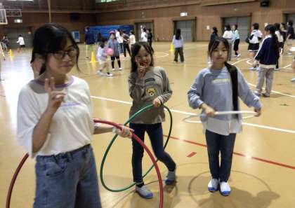体育館のあちこちで、ボールを使って遊んだり、輪投げをしたり、フラフープをしたりと自由な時間を楽しんでいます。