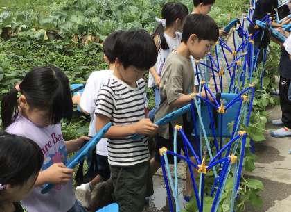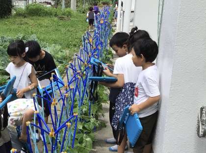 1年1組さん、あさがおの写真をタブレットで撮影していました。