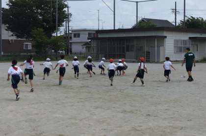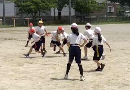 4年1組さん、トヨタ自動車の方が来てくださって、タグラクビーのやり方を教えてもらっています。