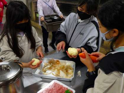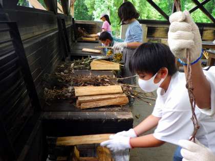 野菜を切るのはもちろん、かまどに木をくべて、火で温めて作ります。