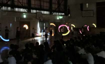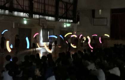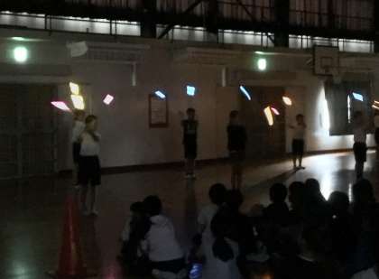 体育館の電気も消し、暗幕も閉めて、真っ暗になった所で、ネオンを点灯させました。