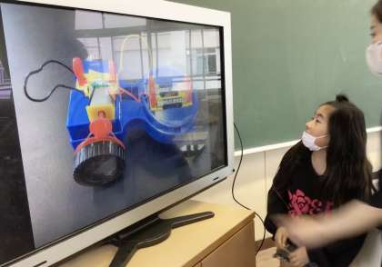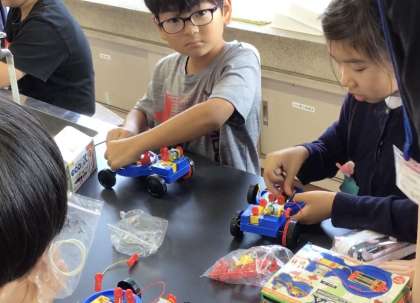 4年2組さん、理科の授業で「電池で動くクルマ」を作っていました.