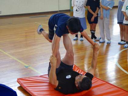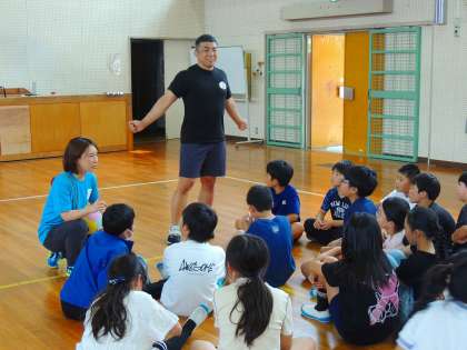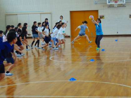夢の教室(5年)2 公開日 2025/06/20 更新日 2025/06/20 各学年から まずは、体育館で講師の白木先生と一緒にゲームをしました。 空中にボールがある間に、ゴールまでみんなで行くのですが、投げるふり(フェイント)で誰か一人でも動いてしまうと、その時点でアウトになります。 失敗するたびに、「次はこうしよう」と意見を出し合い、チーム力を高めていきます。同じミスをしないようによく考えて話し合うことで、次に向けてステップアップすることを学びました。