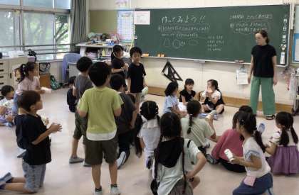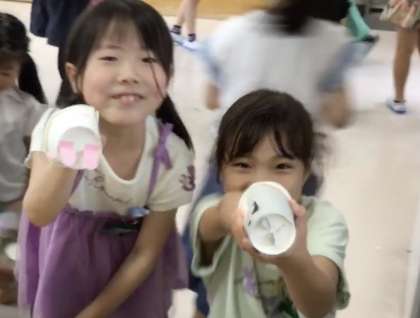2年1組さん、「紙コップを使って飛ぶおもちゃを作る」ということで、たいへん賑やかに、楽しそうに活動中でした.