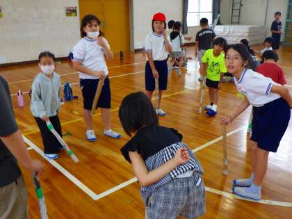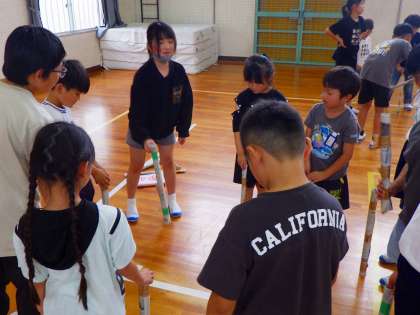 杖のようなものをついていたり、新聞紙を広げて文字を探したり、低学年の子たちも一緒になって楽しめそうな遊びを考える6年生の子たちはたいへんだと思いますが、朝から「どんな遊びを今日はするのかな?」とワクワクしている子もいっぱいです。