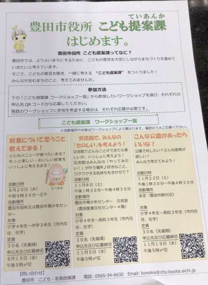 豊田市の「こども・若者政策課」という所が、「こども提案課」というものを始めるそうです.ワークショップを年に3回行い、小学4年生以上の子たちの声を聞いて、みんなの住むまちをより良い方向に変えていこうという取組を考えているそうです.
