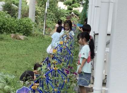 1年生の子たち、登校した後は荷物を片付けて、自分のあさがおの様子を観察に行きます.