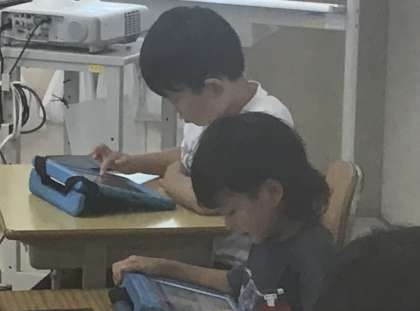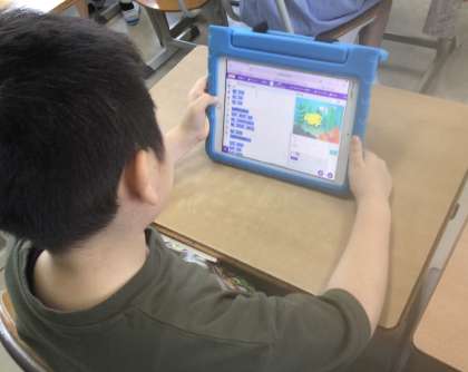 3年1組さん、ICT支援員さんが2名来ていて、3人の先生たちとスクラッチについて勉強中でした.