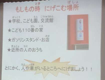 子ども百十番の家がどこにあるか、ガソリンスタンド、学校など近くの安全な場所に逃げ込み、大人に知らせることの大事さを教えてもらいました.