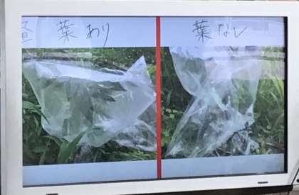 比べてみると、葉っぱありの方だけ、水滴が袋についています.
