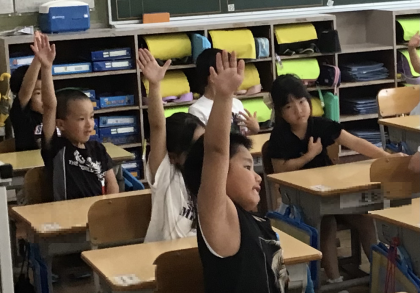 1年1組さん、あさがおの成長の様子を話し合っていました。