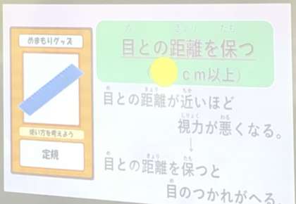 「定規がなくてもわかるよ」「両方の手を広げて見て」養教の先生の助言を受けて、みんな距離を測ってみました。