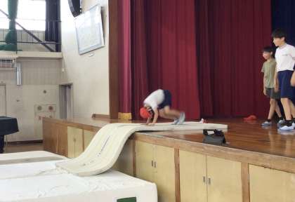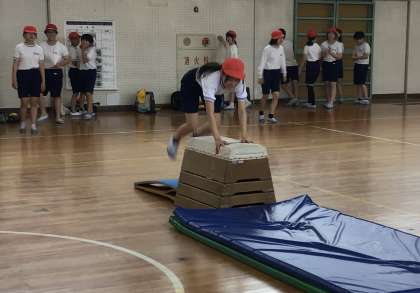 6年1組さん、体育の授業で「抱え込み跳び」の練習を何度も行っていました。