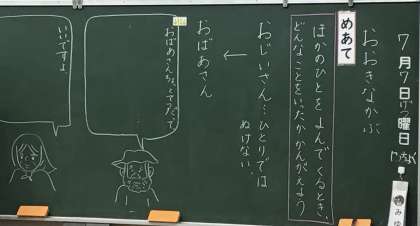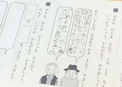 今日は自分でおじいさんとおばあさんの会話を考え、みんなの前で発表していました。