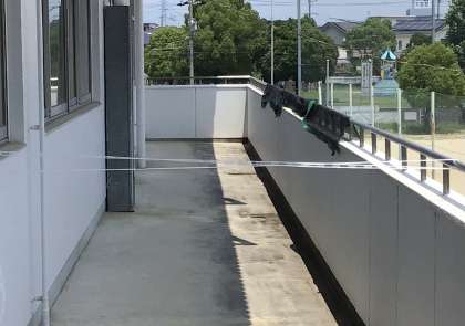 家から持ってきた靴下を洗剤と水を使って洗い、図書室の前のテラスで干してみます。