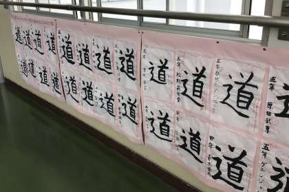 スペースの関係で、1組さんは特別棟への渡り廊下のところに作品があります。