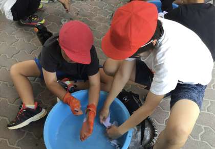 しっかり水と洗剤の量を測って、手洗いをしていました。