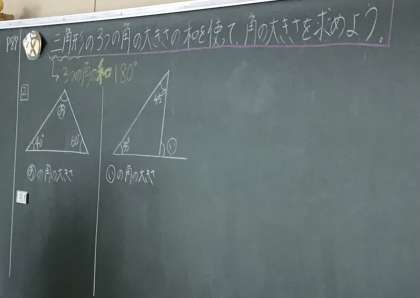 2つの角の大きさがわかっている図形の求め方、三角形の外側の部分の角の求め方について考えていました。高学年になると、算数の得意な子、苦手な子、もっと言えば計算は苦手だけど、図形は得意な子、その逆の子など、いろんな子が出てきます。