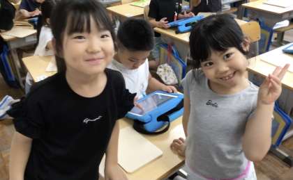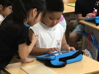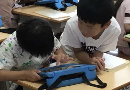 1年1組さん、タブレットの中に入っている国語や算数のアプリを使って勉強をしていました。