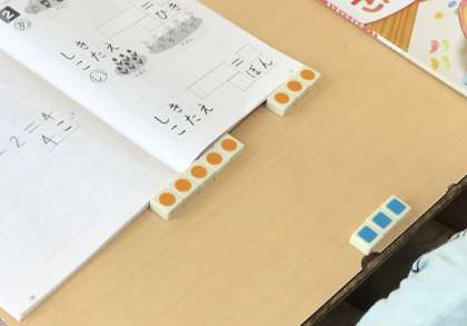 8匹の猫の数を3と5に分けて考えれば答えが出そうだぞ、ということで数図ブロックを動かしてみることになりました。