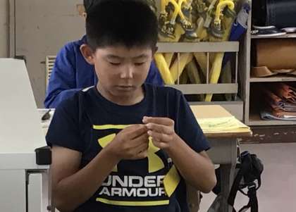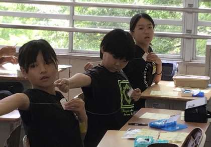 5年1組さん、家庭科の授業で糸と針を使う練習をしていました。