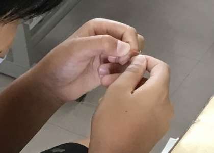 失敗して糸が開いてしまったら、もう一度糸切りバサミを使って、斜めに切ります。