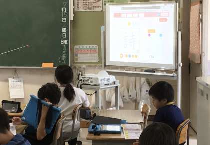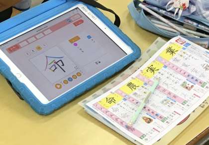 漢字ドリルには二次元コードがついていて、タブレットで読み取ると、真ん中の写真のような画面が出てきます。