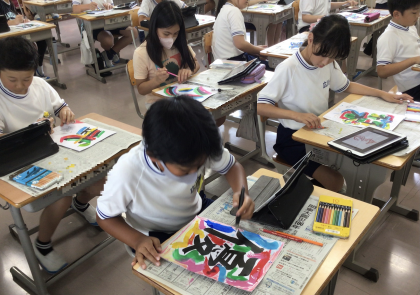5年1組さん、書写の授業で「花文字」に挑戦中です。