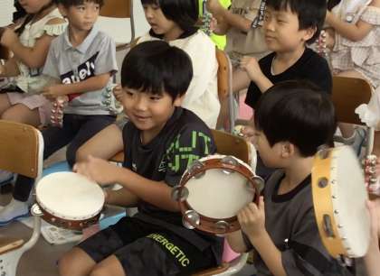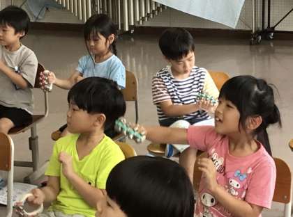 タンブリンとすずを使って、「ぶんぶんぶん」の演奏会です。