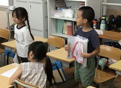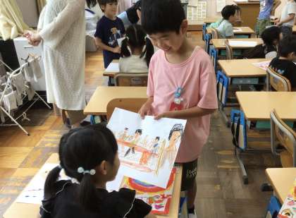1年1組さん、図工の作品が完成したので、隣の席のお友達に紹介するそうです。