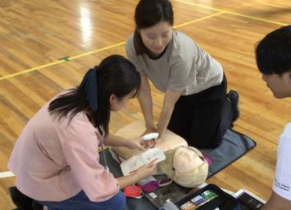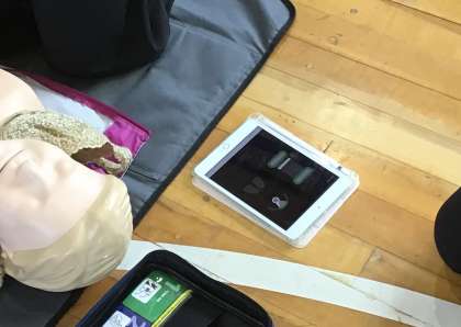 心配蘇生では5年生の子が消防の方から教えてもらった機械を使いますが、押し込むスピードや強さを知らせてくれるタブレットが準備されているので、強弱の具合を覚えることができました。