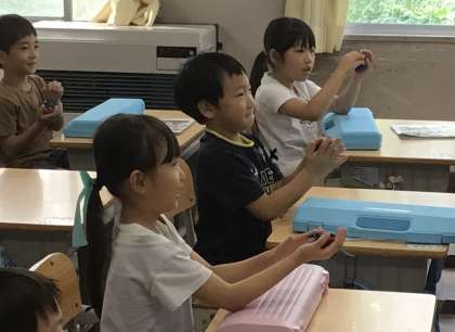 1年1組さん、音楽の授業でカスタネットをリズムに合わせて、叩いていました。