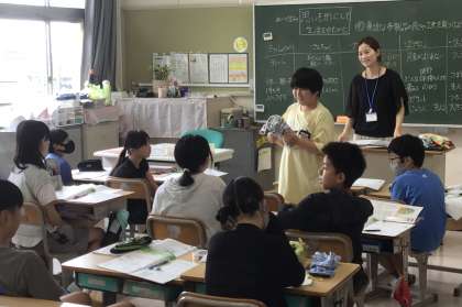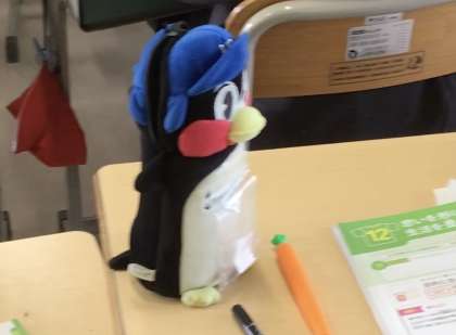家から給食の袋、スワローズの人形など、布でできたものを持ってきて、良さを話していました.