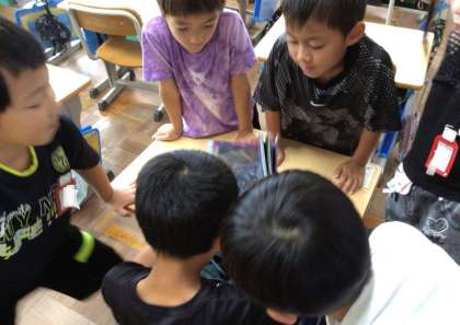 1年生、世にも奇妙な話の本をみんなで集まって見ていました。