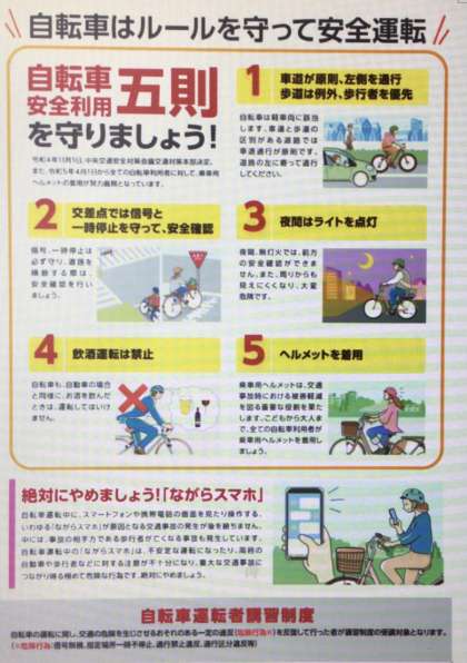 それ以外にも「ながらスマホ」は絶対しない、自転車に反射板を取り付けましょう、などが示されていました。
