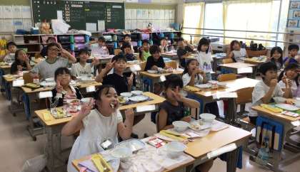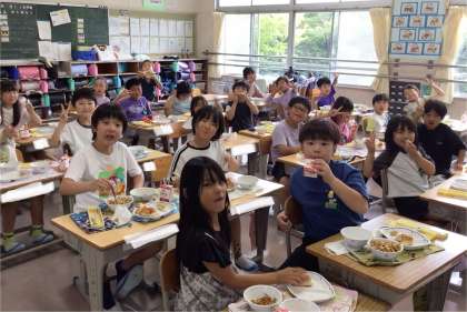 2年生、給食の様子です。 今日の放送では先生たちの血液型クイズが出題されていました。