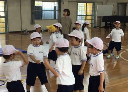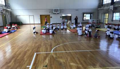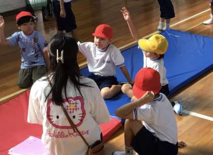 1年生のみんなが体育の授業で、4つのグループに分かれて、「みんなが楽しめるコースを工夫して作ろう」ということで、平均台やフラフープを使って、運動方法を考えていました。