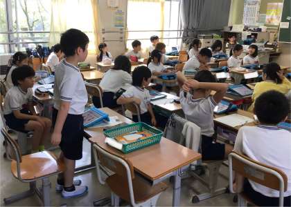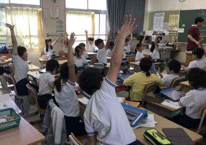 3年1組さん、すごい手の挙げ方です。