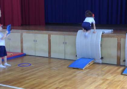 一番下の写真はロイター板を利用して、一気にステージに上がる練習です。