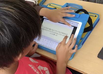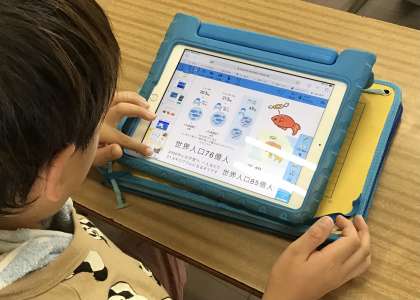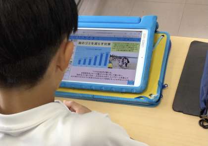 4年1組の教室では、総合的な学習の時間のまとめをパワーポイントを使って行っていました。写真や資料を上手に使って、何枚ものシートを作っています。