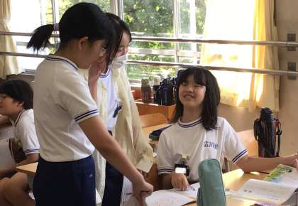 写真は友達と立ち歩いて意見交換をする「あのねタイム」です。